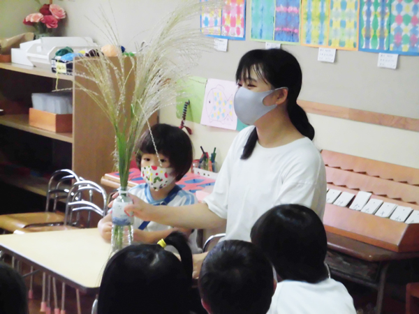 縦割りのクラス編成で異年齢児が共に育ちあうクラス編成を基本とし、必要に応じて年齢ごとの活動を取り入れる保育方法をとっています。異年齢保育の良さは子どもが年長の者にかわいがられ、大事にされている実感が持てること、また逆に年少児とのかかわりで自分の成長を実感できることにあります。それは、人生のどの段階においても育てられて育ち、やがて自分が育てる者に成長する人間社会の縮図でもあるでしょう。育てられる安心感、育てる温かさを知ってもらって、次の段階に送り出したいと考えています。このたび、本園はクラス編成の考えを改め、より一層保育の充実を目指しております。担任保育者が3年間持ち上がることを見直しました。3歳児で入園した子どもの個性、伸びようとする方向性を1年間の保育で理解し、よりよい編成に改めて4歳児に進級していただきます。保育は時代と社会の要請から切り離された営みではありません。子どもたちが日々年々育つように、保育と保育者も育つ存在です。保護者の皆さまとの対話を大切に、常によりよい保育を目指し研鑽してまいりますので、クラス編成の新たな考え方に基づく本園の新たな保育をご覧ください。